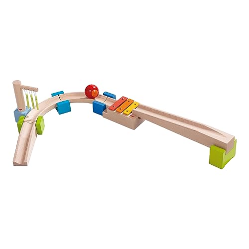 Details und Einschätzung: Haba bietet mit der Grundpackung Klänge eine musikalische Holzkugelbahn an, deren Bauteile auf verschiedene Weisen kombiniert werden können.