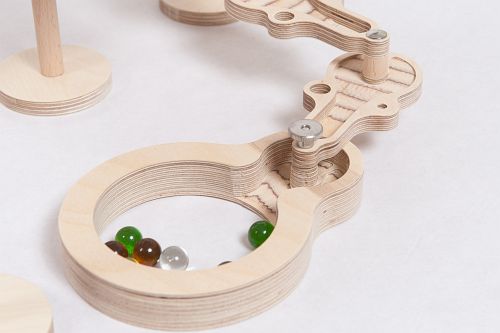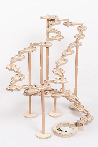Besonderheit des Kuko Ansatzes: Mit zunehmender Anzahl der Bahnteile steigen auch die Anforderungen an den Unterbau aus Stützen und Strebe. Aus dem Kugelbahnspielzeug wird dann ein Konstruktions- und Statikbaukasten, in dem es verstärkt darum geht, die bestmögliche Stabilität und Standfestigkeit zu erreichen.